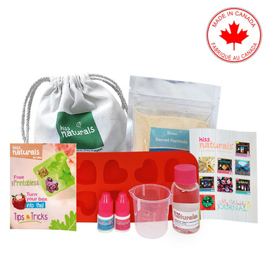 Kiss Nautrals award-winning, all-natural, and eco-friendlier DIY Bath Bomb Kit blends science and fun together in the comfort of your kitchen! Combine the Secret Formula and Witch Hazel together with our signature natural fragrances. Press into the reusable heart-shaped silicone mold, allow to dry, then watch as they fizz and bubble in the bath water! Now available in gold mica.