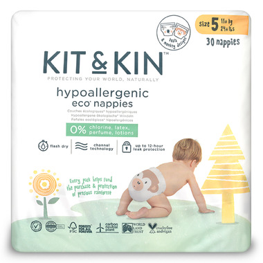 Kit & Kin is the hypoallergenic diaper with premium performance. Featuring a super absorbent core that uses no harsh chemicals, Kit & Kin helps protect your baby's soft delicate skin and safeguard it from sensitive skin problems like eczema and diaper rash. Kit & Kin diapers are the only sustainable diaper with a flash dry layer and patented channel technology for instant dryness and evenly distributed liquid around the diaper, meaning baby's bottom stays dry and comfy for up to 12 hours.