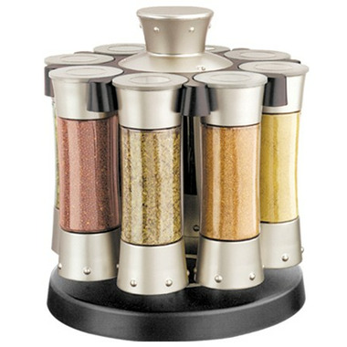 KitchenArt Elite Auto-Measure Spice Professional Carousel measures 1/4 teaspoon with each click. 8 spice bottles on a rotating base. Double stacks or mounts under cabinets.
