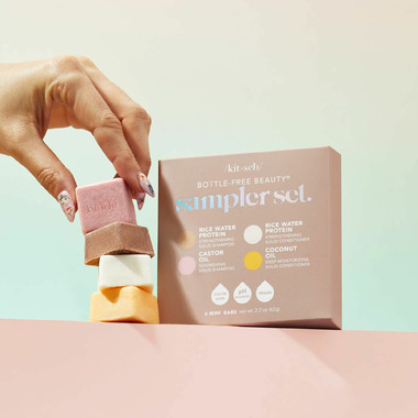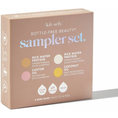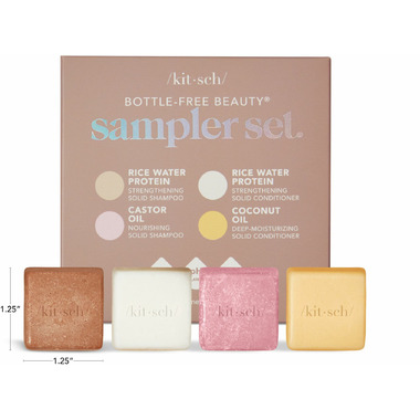 Kitsch Bottle-Free Beauty 4 Mini Bar Sampler Set. Formulated with rice water to help repair damaged hair follicles & prevent split ends Rice Protein has been shown to increase hair volume by 20% after 5 washes.*