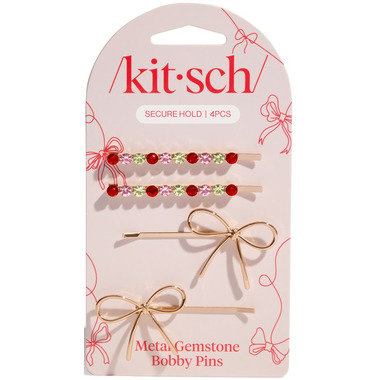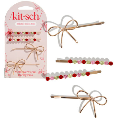 - The Kitsch Metal Gemstone and Bow Bobby Pins 4pc Set - Red, Pink & Green is your new go-to for effortless charm. Featuring a mix of whimsical bows and gem-studded pins in bold, playful hues, this set lets you mix, match, and style your strands your way. Whether you're pinning back bangs, securing layers, or taming flyaways, these high-shine metal pins offer a gentle, secure hold-no slipping, no snagging.