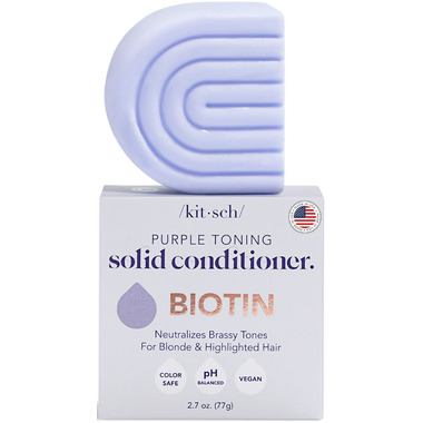 The perfect toning shampoo for all blondes: color-treated, highlighted, and natural. It neutralizes unwanted brassiness and yellow undertones and enriches with Biotin to boost shine, reduce dullness, and strengthen your hair. Enjoy smoother, stronger, and more vibrant blonde hair after just one use! Use regularly to personalize its toning power . Use after Kitsch Purple Toning Solid Conditioner for maximum results. Free of parabens, phthalates, silicones, sulfates, & artificial fragrance. This shampoo reduces single-use plastic: saves two bottles of liquid shampoo or conditioner.