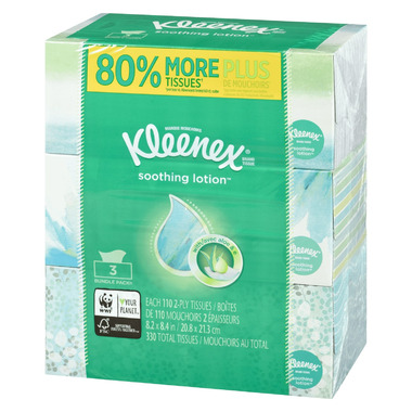 Kleenex Soothing Lotion Tissues are infused with Aloe and Vitamin E to sooth tender skin.