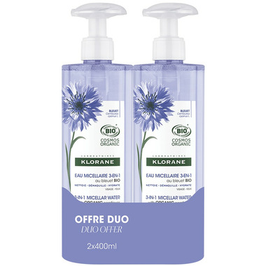 DUO offer of Klorane's 3-in-1 micellar water to clean, remove make-up and moisturize the skin. 100% natural and certified organic.