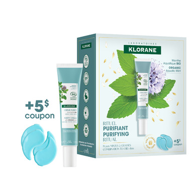 Discover the DETOX Ritual with ORGANIC purifying Aquatic Mint gift set! Contains a 40ml full size purifying Cream with ORGANIC Aquatic Mint, and receive a 5$ off coupon and 2 pairs of the Smoothing and Soothing Hydrogel Eye patches as a gift.