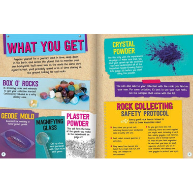 Kick-start your very own rock collection with the 36 stones. Then use the included crystal powder and mold to grow a geode formation. Collect rocks and conduct experiments, such as a scratch test and float test, to discover their hidden properties. You'll even learn how to make your very own rock tumbler. Use the fact-filled book to keep exploring the world around you! Comes with: 36 rocks, display tray, crystal powder, geode mold, plaster, magnifying glass