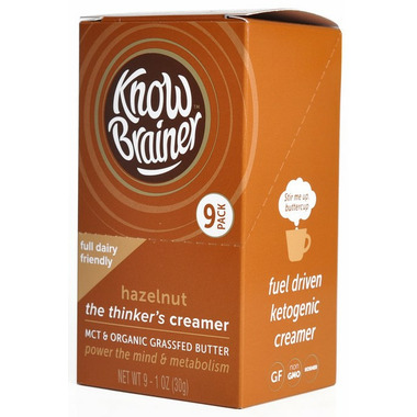 Filled with a perfectly portioned blend of clarified butter made from grass-fed cows, MCT oil, and coconut oil, Know Brainer Ketogenic Creamer Hazelnut is the elevated, keto-friendly creamer option. The hazelnut flavour will make your heart and taste buds happy. Grab a portable pouch for a creamy cup of clean deliciousness! Carefully balanced, wholesome keto ingredients ensure you get the right amount of nutrients in each serving. Provided in a pack of 9 individual packets of 30 grams.