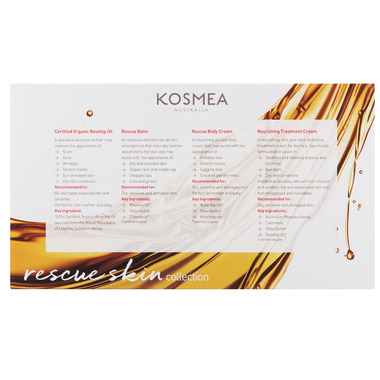 The Rescue Skin Collection contains four Kosmea products perfect for soothing and assisting with multiple skin conditions. Great for trialing Kosmea's rescue range of products. Kosmea's rescue range is nature's first aid kit for the skin, naturally soothing, repairing and protecting for all skin emergencies including babies.