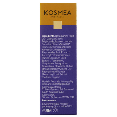 Ingredients: Certified Organic Rose Hip Oil *CoQ10 *Vitamin C *Sea buckthorn Oil *Pomegranate Oil *Raspberry Oil Rosa Canina Fruit Oil*, Caprylic/Capric Triglyceride, Isoamyl Laurate, Camellia Oleifera Seed Oil*, Prunus Armeniaca (Apricot) Kernel Oil*, Hippophae Rhamnoides Fruit Extract*, Ascorbyl Tetraisopalmitate, Punica Granatum Seed Extract*, Tocopherol, Ubiquinone, Pelagonium Graveolens Flower Oil, Rubus Idaeus (Raspberry) Seed Oil*, Rosmarinus Officinalis (Rosemary) Leaf Extract *Certified Organic