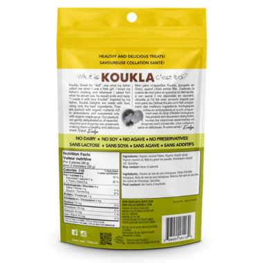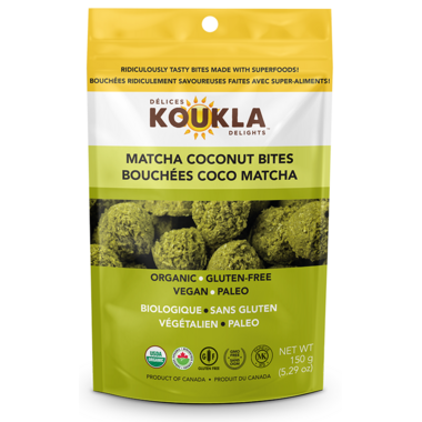 Matcha coconut bites are healthy and delicious snacks that are organic, gluten-free, vegan and kosher.  Koukla Delights are sweetened exclusively with organic maple syrup from Québec and are the perfect blend of taste and nutrition.