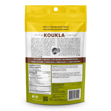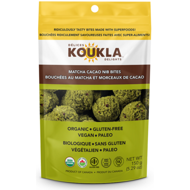 Matcha coconut bites with cacao nibs are healthy and delicious snacks that are organic, gluten-free, vegan and kosher.  Koukla Delights are sweetened exclusively with organic maple syrup from Québec and are the perfect blend of taste and nutrition.