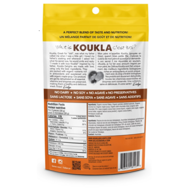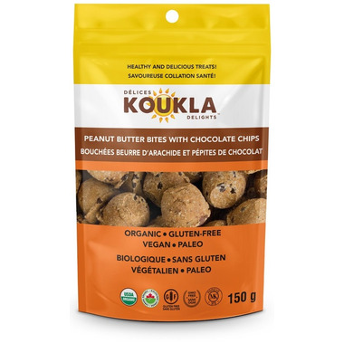 Peanut butter bites with chocolate chips are healthy and delicious snacks that are organic, gluten-free, vegan and kosher.  Koukla Delights are sweetened exclusively with organic maple syrup from Québec and are the perfect blend of taste and nutrition.