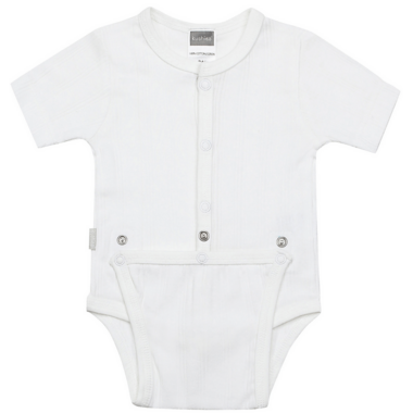 Kushies' Diaper Shirt is great for babies who do not like clothing going over their head. Easy to dress with the full front snaps; as well as, a snap crotch for easy diaper change, and snaps closed which makes changing baby quick and easy. Made from 100% premium cotton this item washes well and can be worn over and over again. Offered in sizes 1 to 24 months.
