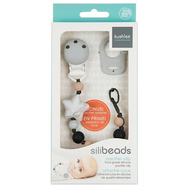 Kushies SiliBeads Silicone Pacifier Clips are the perfect accessory that will ensure your baby's pacifier stays clean and always at hand! Made of food grade silicone, the SiliBeads pacifier clip and tether will secure your child's pacifier so you don't have to keep looking for it when it falls. A bonus pacifier adapter is included which can attach to most types of button style pacifiers.