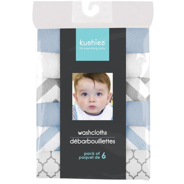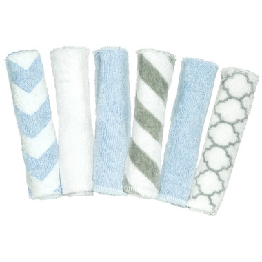 includes six washcloths in blue and grey prints.