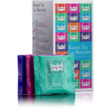 Sortment Of 24 Muslin Bags Of Flavoured Teas And Herbal Tea. The Wellness Teas assorted box of 24 enveloped muslin tea bags is ideal for trying all of Kusmi's unique Wellness blends. Perfect for a gift.