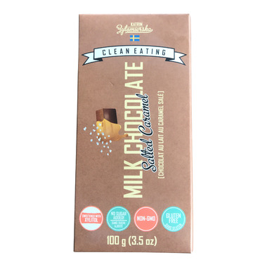 A smooth milk chocolate bar with salted caramel flavour. Naturally sweetened with xylitol.
