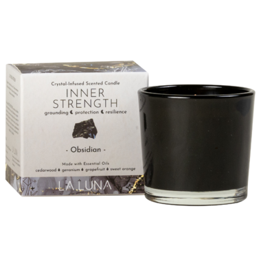 The INNER STRENGTH candle, associated with the root chakra, contains Obsidian crystals, known to help anchor our energy in the present and promote resilience in times of stress. The essential oils of cedarwood, geranium, grapefruit and sweet orange reinforce the feeling of stability and balance.