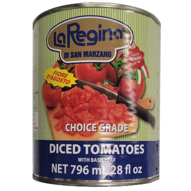 La Regina di san Marzano Whole Peeled Tomatoes with basil leaf made with 100% Italian tomatoes.