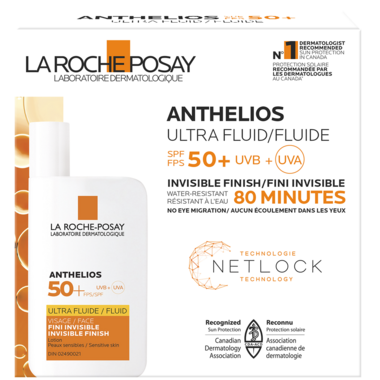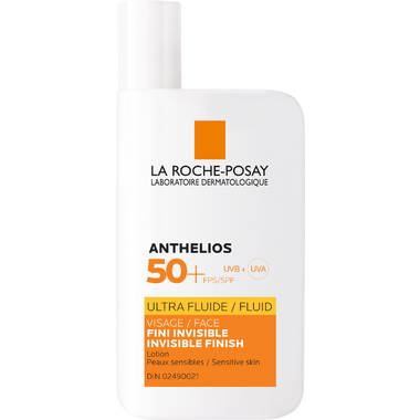 La Roche-Posay Anthelios Ultra Fluid Face Sunscreen SPF 50+ has an ultra-light texture and is fast absorbing. Water resistant 80 minutes. Sweat resistant. No eye migration. Fragrance-free. Paraben-free. Non-Comedogenic. Allergy-Tested. Dermatologist Tested. Invisible Finish.