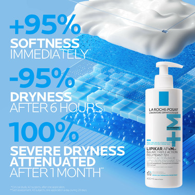 *Consumer study on 139 subjects presenting itch sensations due to dryness. Result 24h after stopping product use following 15 days of product application once a day.Directions: Apply Lipikar Baume AP+Max triple action lipid-replenishing balm to the entire body and face once a day, massaging gently.