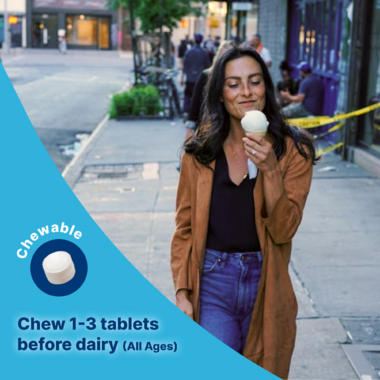 Chew or swallow 1-3 tablets before consuming lactose products like cheese, milk, ice cream, and pizza. Adjuts dose to suit your needs.