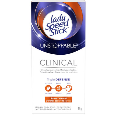 Lady Speed Stick* Clinical Protection Antiperspirant is designed with Triple Defense Technology to protect you night and day.