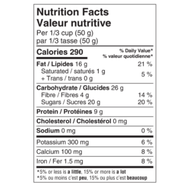 Packed in a facility that also processes peanuts, tree nuts, wheat, milk, soybeans (soya), egg and sesame.