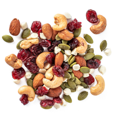 Sugars (dried cranberries (cranberries, cane sugar, sunflower oil), yogurt chips (sugar, palm kernel oil, whey powder, powdered whey protein concentrate, greek style yogurt powder (milk protein concentrate, skim milk powder, lactic acid, citric acid, bacterial culture), soya lecithin, sorbitan, tristearate, citric acid, natural flavour)), Roasted cashews (cashews, canola oil), Almonds, Pumpkin seeds