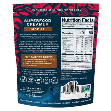 Optimal performance for healthy living – Laird Superfood Mocha Creamer adds an energy boost to your coffee, tea, smoothies and food. Harness the benefits of coconut, aquamin and raw cacao to help power through your day.