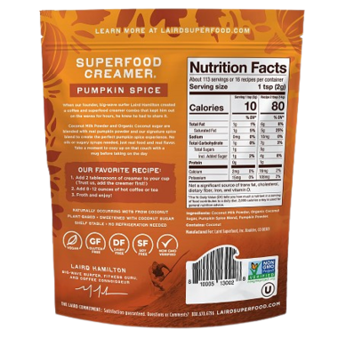 Laird Superfoods Pumpkin Spice Creamer an energy boost to your coffee, tea, smoothies, & food. Great source of vitamin C with natural electrolites.