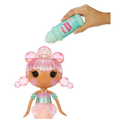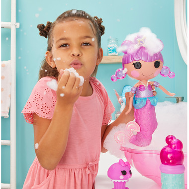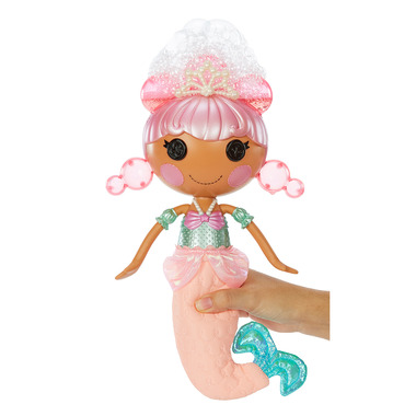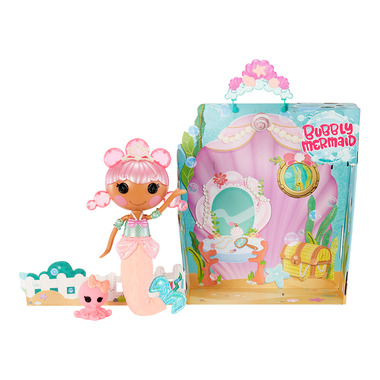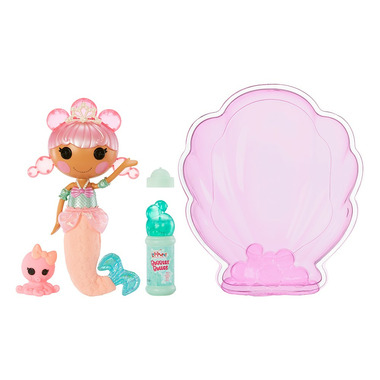 Lalaloopsy Bubbly Mermaid loves to play in water! Just add bubble solution to Doll and squeeze, and Laguna Sea Splash grows bubble hair! Her pet Octopus squirts water too. Includes shell tub for water play anywhere, bubble solution and more.