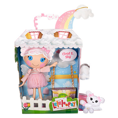 Each NEW package is a reusable house playset with photo details of found objects that uniquely express the personality of each doll, like Cloud E.'s hot air cloud and basket in her house. Child helps build the house with extra pieces! Build the rainbow cloud pet house cloud, add the rainbow and halo cloud chimney, and attach the cloud balcony. Connect Cloud E.’s house with other houses to create Lalaloopsy Land!