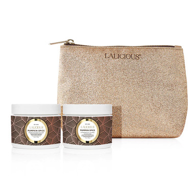 Fall in love with pumpkin spice with the LALICIOUS Pumpkin Spice Mini Set! Featuring two LALICIOUS favorites and a chic gold glitter bag, the ultra-hydrating duo leaves skin smooth, soft and delectably delicious.