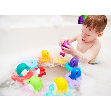 MATCH AND LEARN: Play a matching bath game by dropping each dolphin into its colored ring
