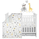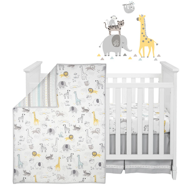 The four-piece nursery crib baby bedding set includes one quilt, one 100% cotton jersey fitted crib sheet, one crib skirt and a complete set of wall decals. This neutral color palette of jungle animals in shades of gray, taupe, yellow and turquoise is perfect for baby boys and baby girls. Our favorite jungle animals are featured including giraffes, elephants, tigers, zebras, lions, monkeys and sloths on a soft white ground. The back of the quilt is a colorful modern horizontal pattern with dots, triangles, and chevrons. The animal print breathable 100% cotton jersey fitted crib sheet is extra soft for baby's comfort. It has elastic all the way around ensuring a safe and secure fit. The crib skirt gives the finishing touch to your childҒs crib. It is a cotton blend in a light gray twill fabric with a white and gray printed twill tape feature and has a 14" drop. There are two pleats on the front panel. Complete this jungle inspired nursery collection with a complete set of custom wall decals.