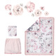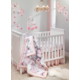 This beautiful reversible floral themed baby bedding nursery set comes complete with a quilt, 100% cotton fitted crib sheet, pom pom trimmed crib skirt and a complete set of wall decals. These gorgeous blossoming flowers are in shades of soft pink with gray accents. It looks like an exquisite watercolor painting and has a border of a linen rayon blend.