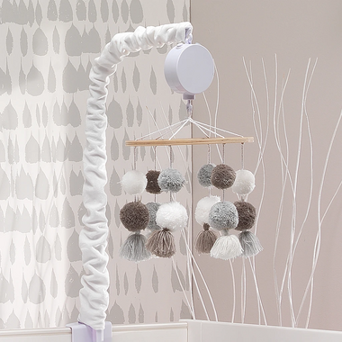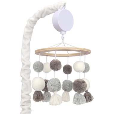 Soft furry pom-poms decorate this charming musical mobile. It has six strings of multiple pom-poms with tassel like trim in earth tone colors which is perfect for boys and girls. The scrunchie which covers the mobile arm is in white velour. This battery operated musical mobile plays nursery songs for 20 minutes, has an on/off switch and volume control.