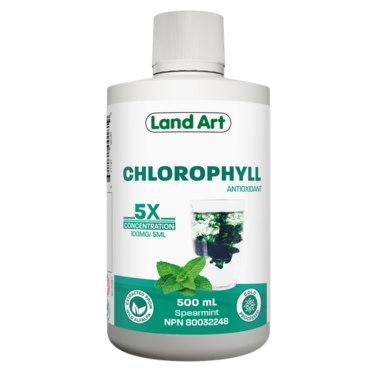 Land Art's chlorophyll contributes to the purification of the blood by oxygenating red blood cells and helping your body to release toxins. Chlorophyll also helps to alkalinize and deodorize the body. Land Art’s chlorophyll is extracted from alfalfa and dosed 100 mg per 5 mL.