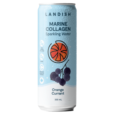 Landish Marine Collagen Sparkling Water Orange Currant has 5g of wild marine collagen, 0g of sugar and is an excellent source of vitamin c.