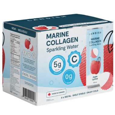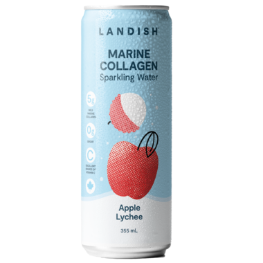 Landish Marine Collagen Sparkling Water Apple Lychee has 5g of wild marine collagen, 0g of sugar and is an excellent source of vitamin c.