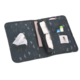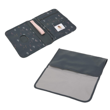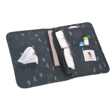A compartment for wet wipes with a practical opening slit, various pockets for diapers and the like, a zipped pocket for odds and ends, as well as a tape for fastening a pacifier, make this a practical accessory. A water-repellent, soft padded changing mat that matches the bag, ensure an optimum diaper change for baby.