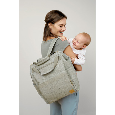 The convenient clasp and a well-organized interior ensures you have everything at your fingertips. Large compartments and accessories such as a water-repellent changing mat, an insulated, removable bottle holder, a removable compartment for baby food jars, a cell phone compartment, key ring and much more make the Goldie Backpack a really practical and commodious holdall. In less than no time, the backpack can be turned into a shoulder bag thanks to the extra shoulder strap. And the stroller hooks make it possible to remove the bag from your shoulder and directly attach it to the stroller or bike trailer. That is back-friendly and convenient as well.