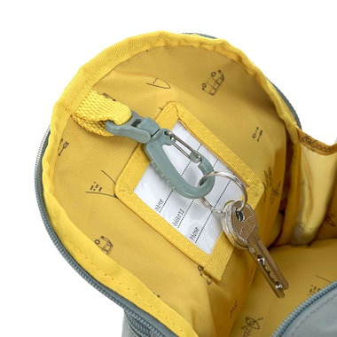 The backpack is made of water-repellent outer material and offers a large main compartment. In the large main compartment there is space for a change of clothes, sandwiches, fruit and snacks. If the food is to remain fresh for a longer period of time an ice pack can be placed in the separate compartment at the base of the backpack and secured by rubber retainers.  A drinking bottle can be stowed in the mesh pocket on the outside. A further pocket in front provides a safe place for smaller items like a key. The padded shoulder straps can be individually adjusted to the child's size and a chest strap provides extra stability. A clear name badge sleeve on the inside prevents any mix-ups.