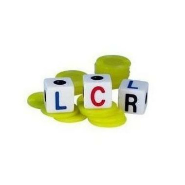 This game consists of three dice and a set of poker chips. Each player starts with three chips and on their turn a player rolls the three dice. For each "L" rolled, they give a chip to the player on their left. For each "R" rolled, they give a chip to the player on their right. For each "C" rolled they put a chip in the middle of the table. For each dot rolled, nothing occurs. The dice are then passed to the next (clockwise) player. If at any point, only one player has all of the chips, that player wins the game.
