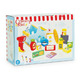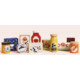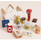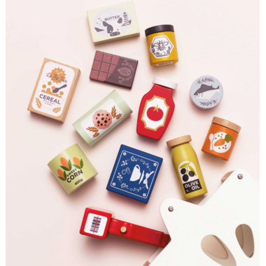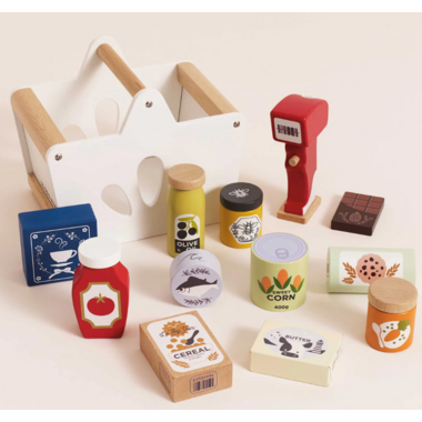 An extensive set including a wooden basket and more than a dozen solid wood grocery items plus a fun barcode scanner and some barcodes stickers. The illustrated grocery items include tuna can, butter, a baguette, cookies, sweet corn, ketchup, olive oil, spaghetti, chocolate and cereal. Great for pretend shopping, counting and language development.
