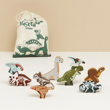 This 9-piece set, complete with cotton drawstring bag, will captivate little ones for hours. These stacking dinosaurs offer double the fun with their unique design. One side showcases highly detailed painted dinosaurs, while the other side reveals an intricate fossil. Let your child embark on exciting adventures by stacking and balancing these pieces as highly as their skills allow. Painted in water-based, non-toxic, paint, plastic free, and made from FSC - Certified wood, each dinosaur is environmentally friendly. Watch imagination soar and curiosity ignite, as little ones explore the prehistoric world of dinosaurs through play.