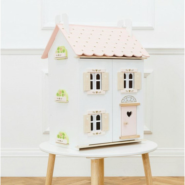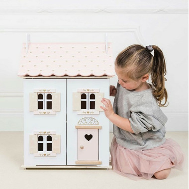 Welcome home. This delightful dolls house makes a stunning gift for a special little someone. Painted in fresh white with soft pink accents and gold heart motifs, it is ready to move right in to. Crafted from sustainable FSC - certified wood, this durable, high quality toy features a scalloped roof, opening and closing doors and shutters for realistic play, plus a clever lift off roof that reveals access to a sweet attic bedroom. Inside, the floors are furnished in a lovely natural wood look to complement the lovely wallpaper designs in each room. The Roseheart House comes unfurnished, ready for little ones to decorate to their hearts desire. Shop their full range of beautiful accessories, furniture and dolls.