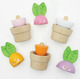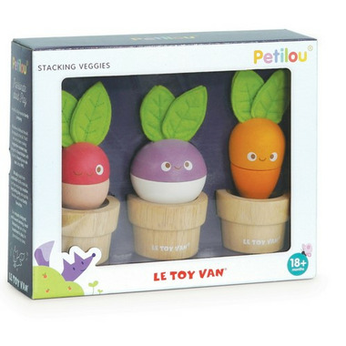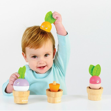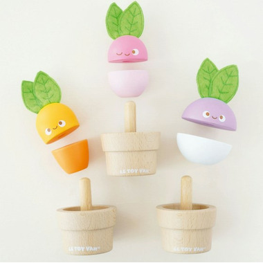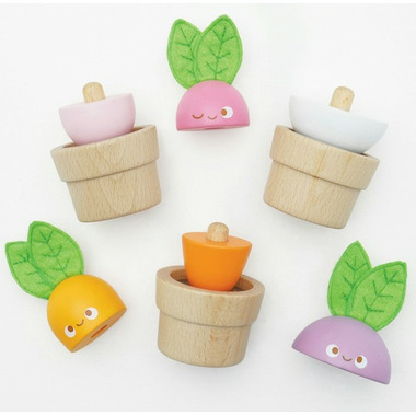 A delightfully quirky set of three happy wooden vegetables in natural wood pots. Includes six detachable interchangeable stacking parts. Mix and match to create a carrot, beetroot and radish. Made from solid and smooth replenish-able rubber wood and finished in gorgeous water-based colours with beautifully hand sewn fabric leaves.