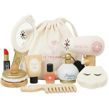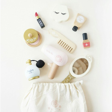 Inside the cosmetics bag you'll find an assortment of wooden accessories including a perfume bottle with a bulb atomizer, hand held mirror, hair dryer, comb, a shell compact make up kit, lotion, nail varnish, lipstick and a powder puff.